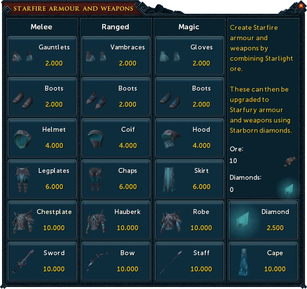 To upgrade all starfire equipment to starfury will cost 47,500 starlight ore, assuming the player possesses no starfury items from a previous promotion, and does not win any starborn diamonds from Treasure Hunter.