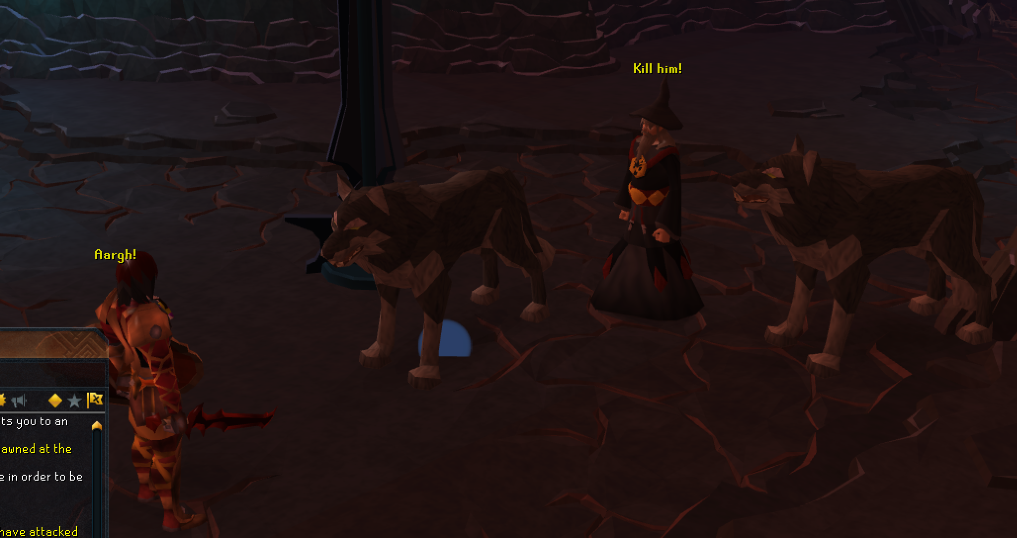 - Upon being attacked by two Fire giants in the Chaos Tunnels: