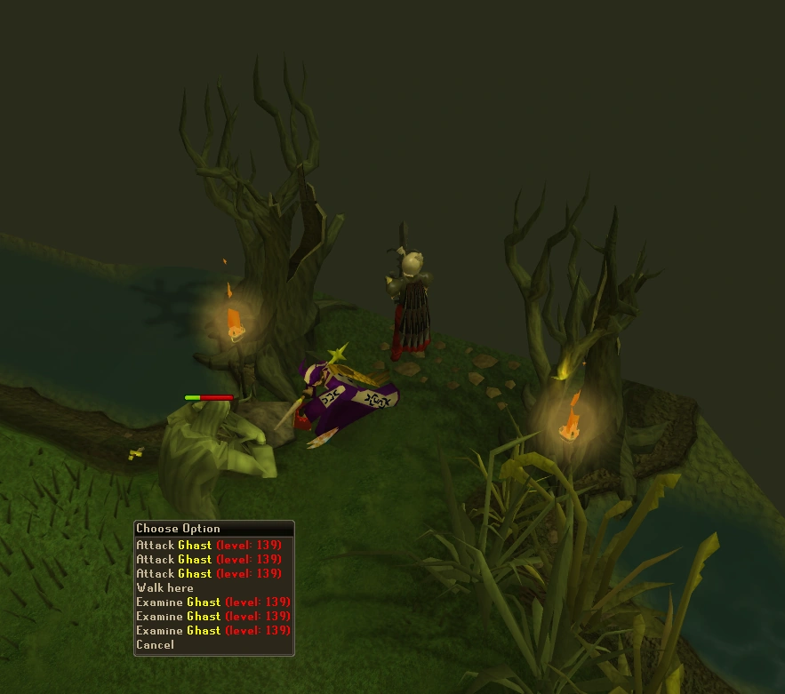 Once an event occurs, the player and follower are pulled into the event area. The player will start in front of a section of path with blue stones. Right-clicking will display an Escape option, which completely abandons the trek and leaves the player wherever they have reached on the map, often in the middle of Mort Myre Swamp. At the opposite end of the area is the path that allows the player to "Continue-trek", once the event is completed. In combat events on the easy and medium routes, there are paths that evade-event that when used will skip the event and continue trekking, adding no reward and increasing the chance for another event. Some of the monsters must be killed before being able to use Evade-event.