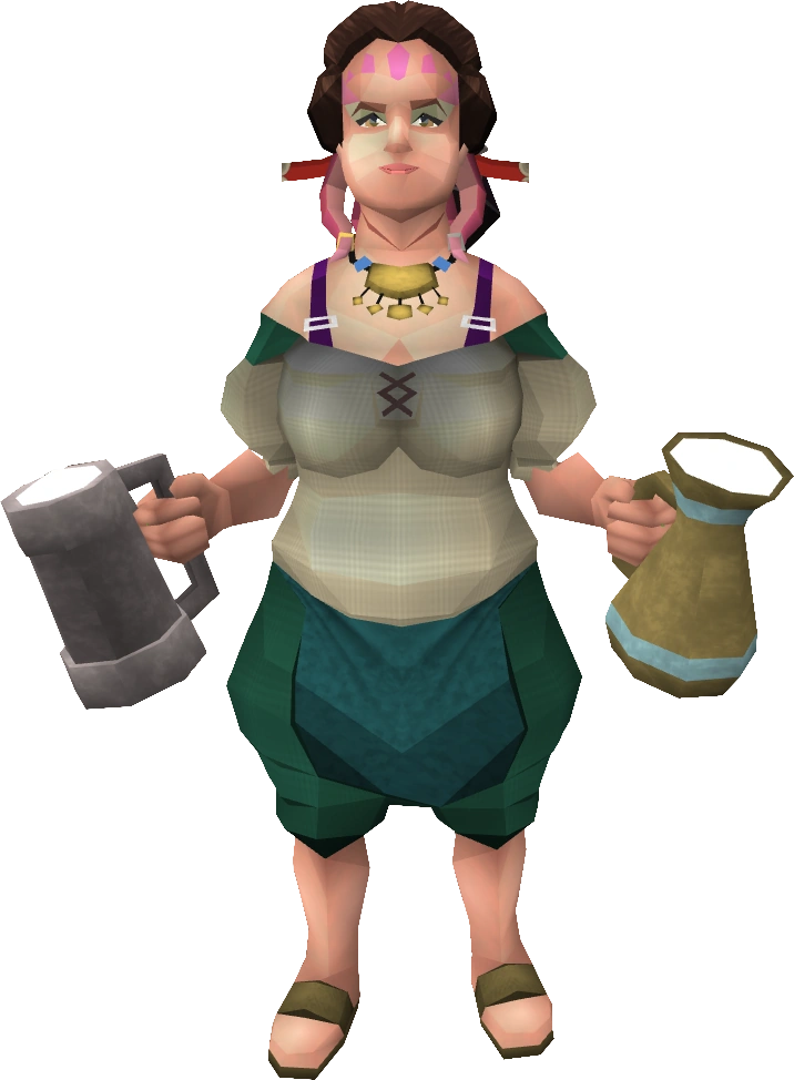After completing a voyage, players will sometimes receive the following message: "The Barmaid had a tricky time while the Ship was away. Speak to her to relive the events." For this minigame, the player takes control of Surula and must serve beer to 20 clients in the bar area, upstairs, and nearby outside, all in fewer than 10 minutes. Surula can hold only 2 beer glasses at once so she has to return to the bar to get more after serving every two customers. Once a client has been served, the "Serve Patron" option will no longer appear on the client. This is a good indicator of whether the patron has been served already or not.