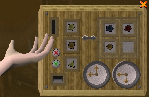 To insert a shape, click on it from your inventory to make it appear in your hand, and then click on the coin slot icon. Click the small green square to submit the crystal disc.