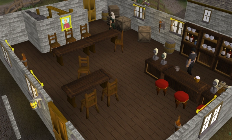 Wizard's mind bomb, dwarven stout and Asgarnian ale were all purchasable from this bar for two coins each. An Asgarnian ale and a empty beer glass spawned on the bar counter.