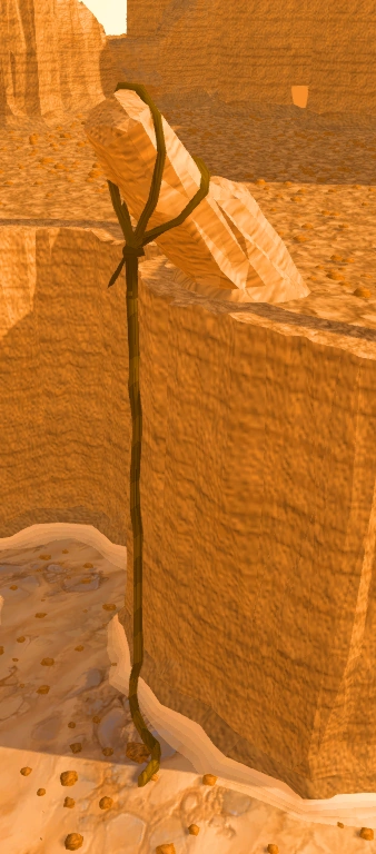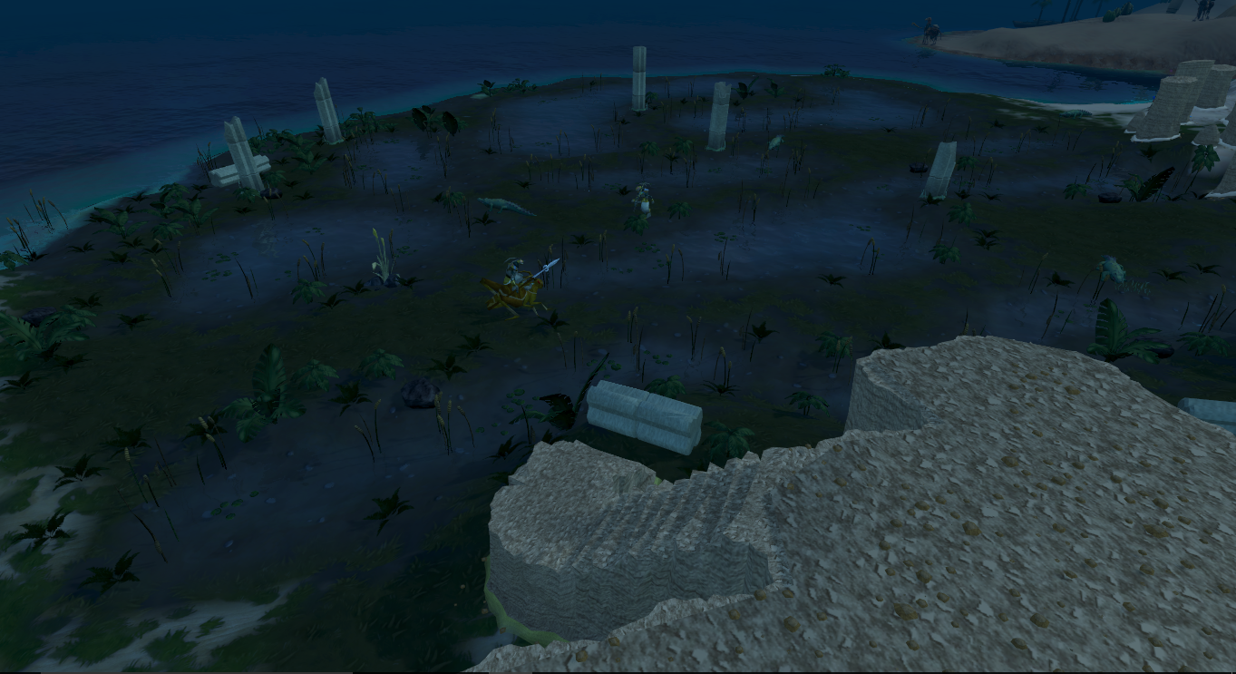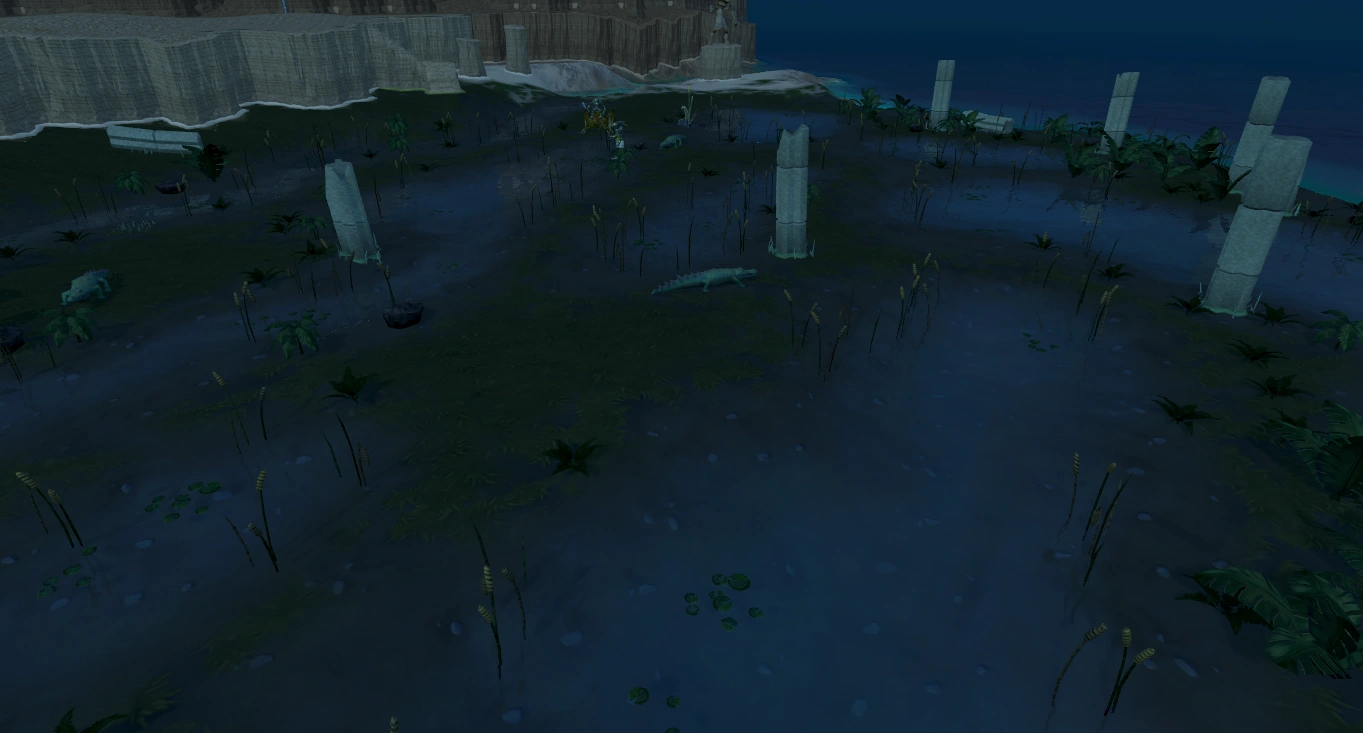 A fallen pillar blocks access between the swamp and rock stairs to the plateau; the player must click on the pillar to climb over it, which takes a short amount of time.