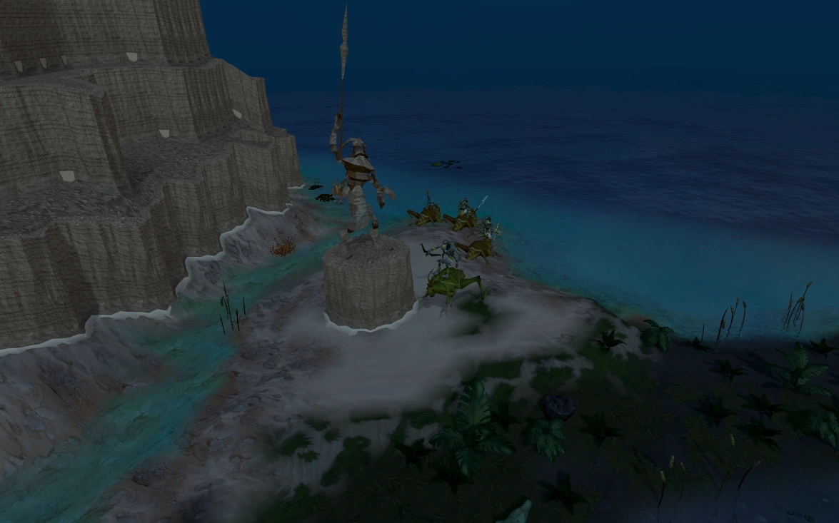 North-east of the swamp is a coastal region with several Scabarites there. They can attack with melee and ranged but not magic. A few will sometimes enter the edges of the swamp, so that the player can be attacked by crocodiles and Scabarites at the same time. The rangers will also shoot into the swamp but cannot fire over the vegetation, so there are several places along the edge of the swamp near the Scabarites that are safe from ranged attacks. The Scabarites here will become unaggressive after a while but will later become aggressive again and will continue to cycle between the two states over time. Some players assigned Scabarites as a Slayer task come here.