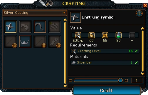 Unstrung symbols are made by using a silver bar on a furnace while holding a holy mould. This requires level 16 Crafting and awards 50 Crafting experience per symbol. It takes approximately 51 seconds to convert a full inventory of silver bars into 28 unstrung symbols.