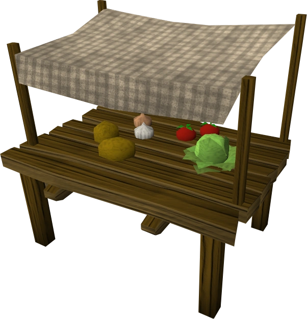 Vegetable stalls are stalls that may be stolen from at level 2 Thieving. Thieving from these stalls in Miscellania will reduce the player's approval rating if they are managing the kingdom. Successfully stealing loot provides raw potatoes, tomatoes, cabbage, garlic, and onions, and it gives 10 Thieving experience.